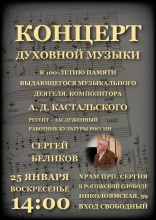 Концерт духовной музыки к 100-летию памяти выдающегося музыкального деятеля, композитора А.Д. Кастальского состоится в воскресенье 25 января в храме преп. Сергия Радонежского в Рогожской слободе, Николоямская ул., 59.