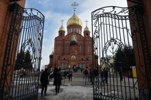 Отпевание проходит в Знаменском кафедральном соборе в центре Кемерово. Здесь собрались десятки учеников гимназии номер 17, где Дарсалия работала учителем иностранных языков, сотрудники гимназии и ее друзья.